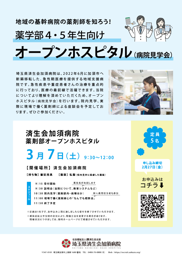 当院についてより理解を深めていただくため、薬学部4・5年生を対象にオープンホスピタル(病院見学会)を行います。院内見学、実際に現場で働く薬剤師による座談会を予定しております。ぜひご参加ください。