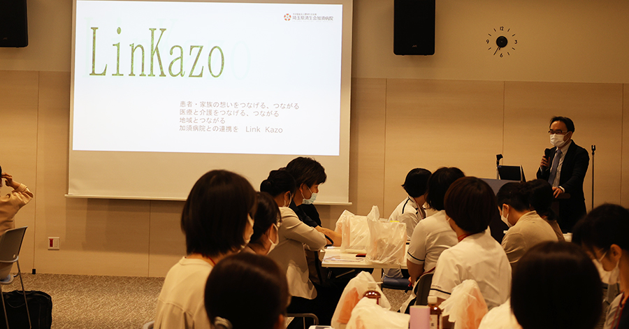 10月3日、当院の講堂にて「LinKazo(リンクかぞ)」を初めて開催しました。この会は、利根保健医療圏内の各病院で退院調整業務を担う皆さまとの情報・意見交換の場を設け、今後の地域内の退院調整を円滑にできるよう顔の見える関係作りを目的として行われました。当院の入退院支援センターで企画立案、平日の就業後にも関わらず16病院28名と多くの皆さまにご参加いただきました。