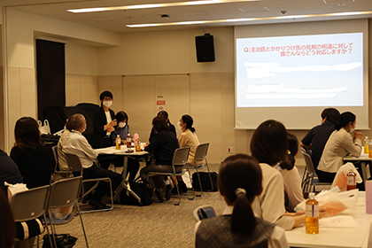 事例発表は3つ行われ、まず当院の看護師より「抗生剤の治療継続でも転院可能となった事例」を紹介しました。次に「主治医とかかりつけ医の見解に相違があったケース」「複合的課題を抱える家族・本人への支援」と題し当院のMSW(社会福祉士)より発表を行った後、各事例を基にグループディスカッションを行いました。