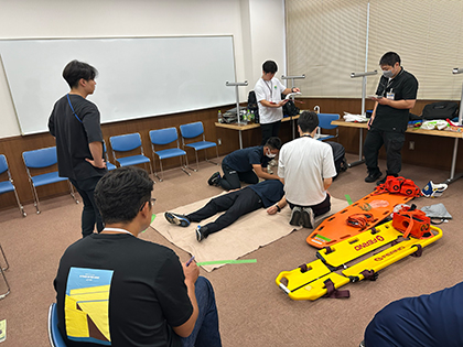 今回のセミナーでは、外傷現場を想定した複数のシナリオにおいて、適切かつ迅速な観察・緊急処置の必要性と適応の判断・傷病者に応じた処置と医療機関の選定などができるよう重点的にシミュレーションを行いました。